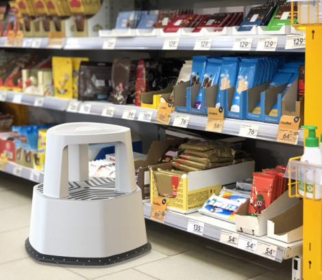 Передвижной табурет-стремянка STEPP PRO позволяет без труда добираться до полок, расположенных выше человеческого роста. Особенности: оснащён колёсиками, с помощью которых табурет легко передвигать, даже если руки заняты имеет резиновую окантовку и вставки, что предотвращает скольжение табурета на полу и скольжение ног на табурете подходит для использования в магазинах, аптеках, на складах, в офисах, а также дома или в гараже. Характеристики: высота: 440 мм максимальная нагрузка: 150 кг вес: 2,8 кг материал: пластик Табурет поставляется в разобранном виде.