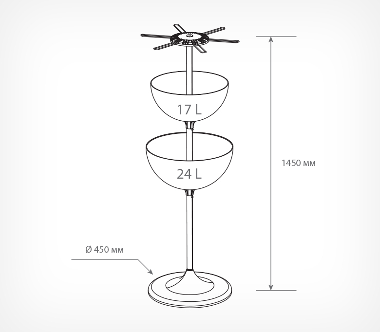 Дисплей UNIBOWL-17-24-HP-6 — это компактный дисплей с двумя чашами объёмом 17 и 24 литра и платформой с крючками.